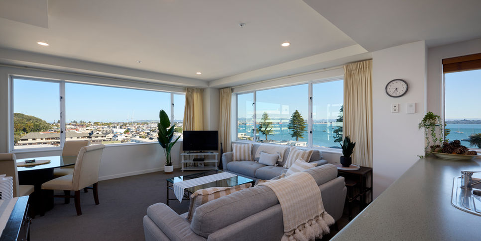 Positioned to capture sweeping coastal beauty, this refined two-bedroom apartment offers uninterrupted 180-degree views spanning Pilot Bay through to the iconic surf of Mount Maunganui Main Beach.
